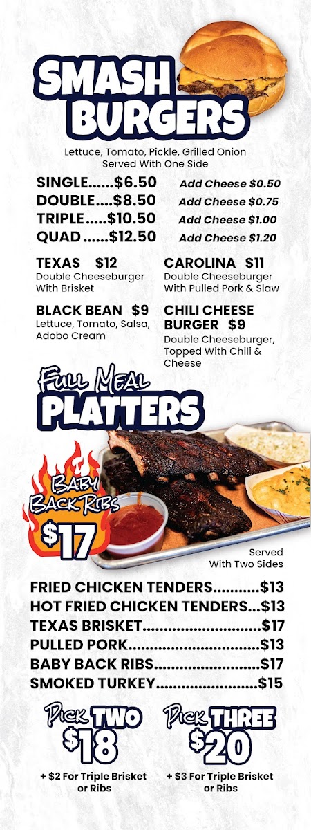 Smoked N Smashed pick any three different types of meat served with two sides and bread.